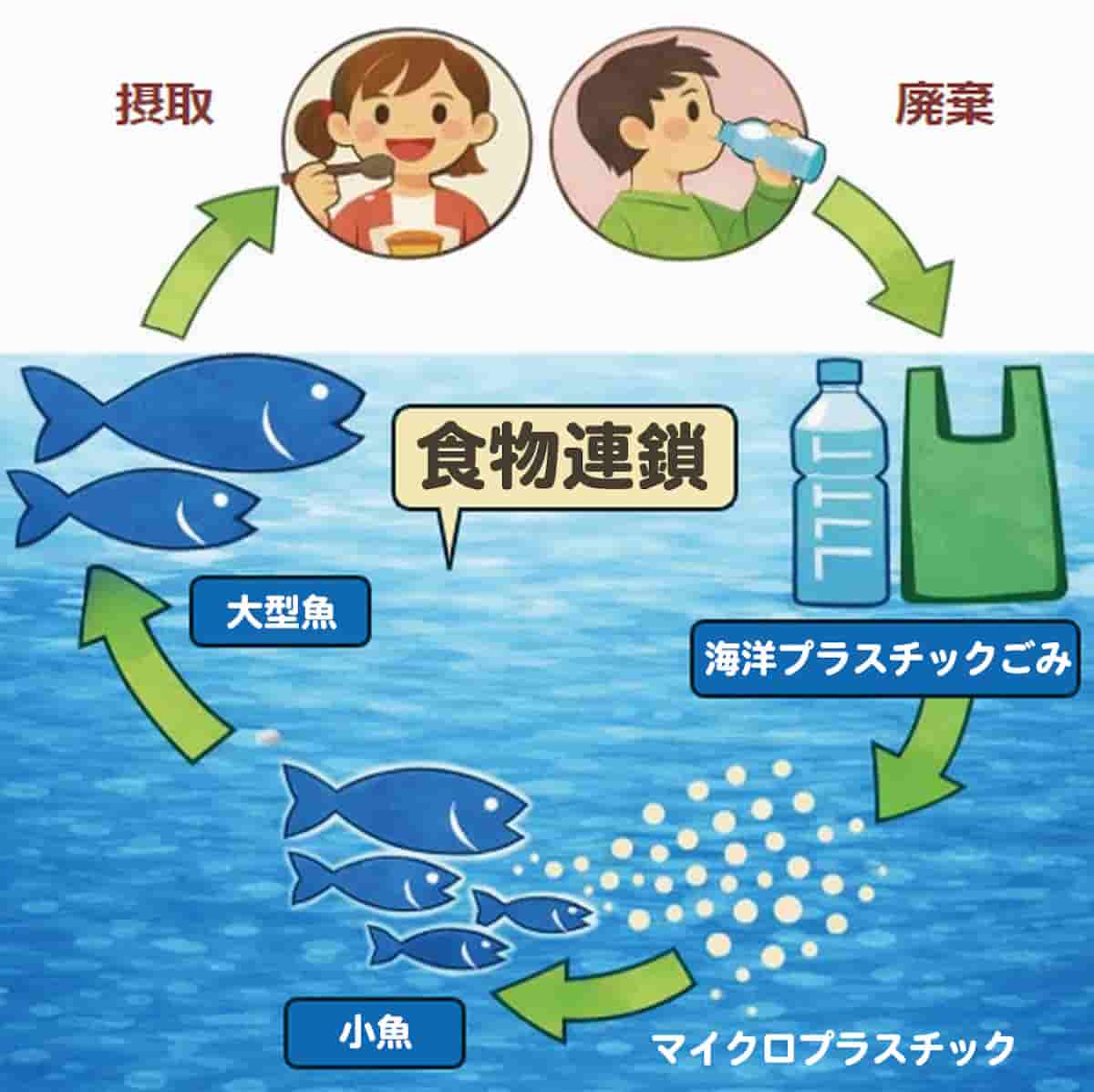 マイクロプラスチックは、小さな魚 → 大型の魚 →人間へと、食物連鎖を通じてつながっていると言われています。