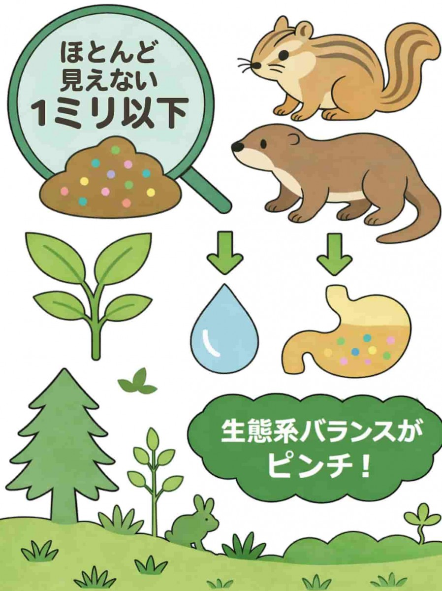野生動物のフンの中に含まれていたマイクロプラスチックの多くは、サイズが1ミリ以下で、肉眼ではほとんど見えないほどの大きさです。それらは、植物と一緒に食べられたり、水と一緒に飲み込まれたりして、知らないうちに動物たちの体の中へ入っていたのです。