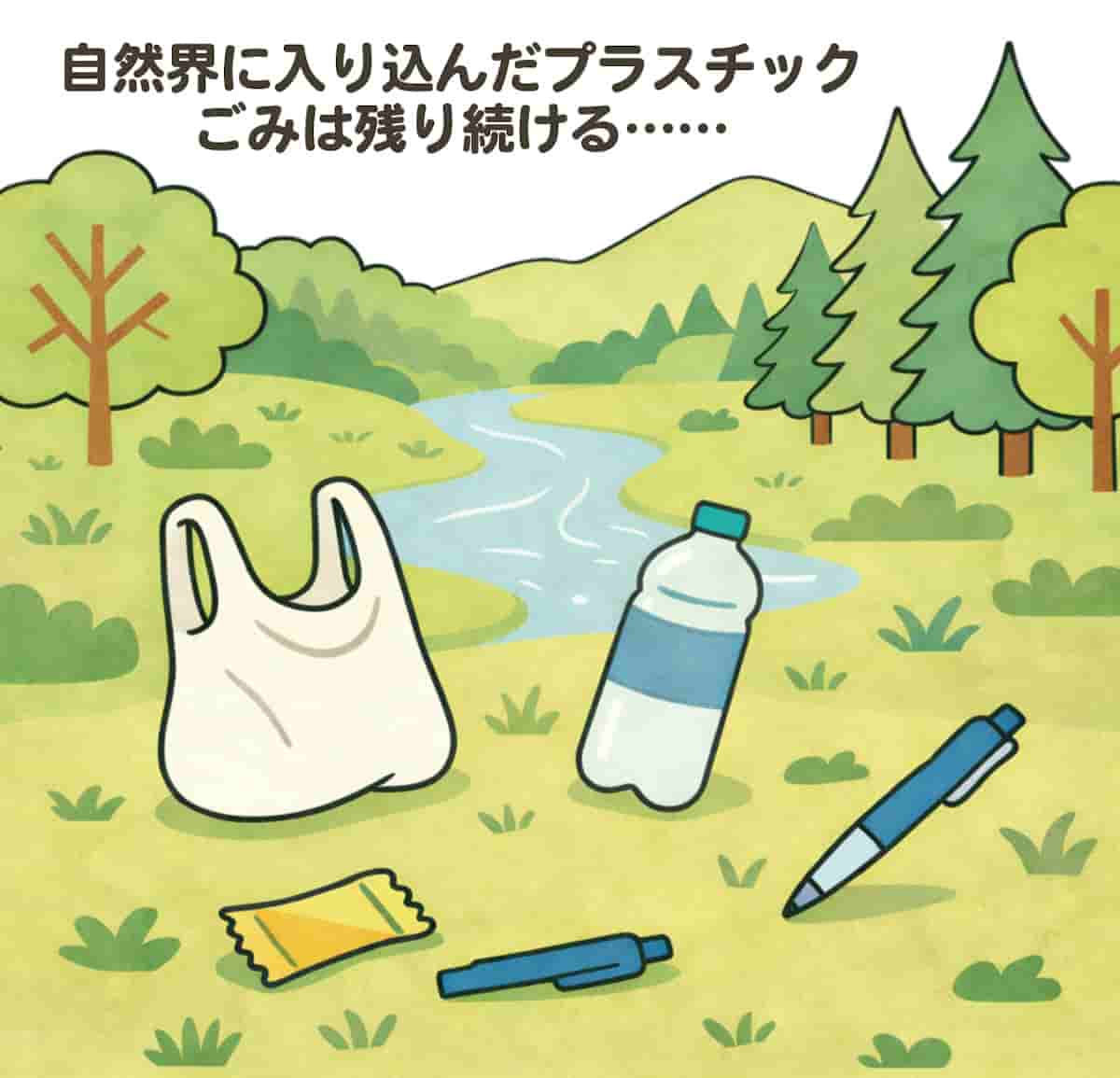 レジ袋や、お菓子の包装、壊れたボールペンなどのプラスチックごみ、洗濯の際に流れ出た化学繊維などは、雨に流され、風に飛ばされ、山や森にたどり着きます。