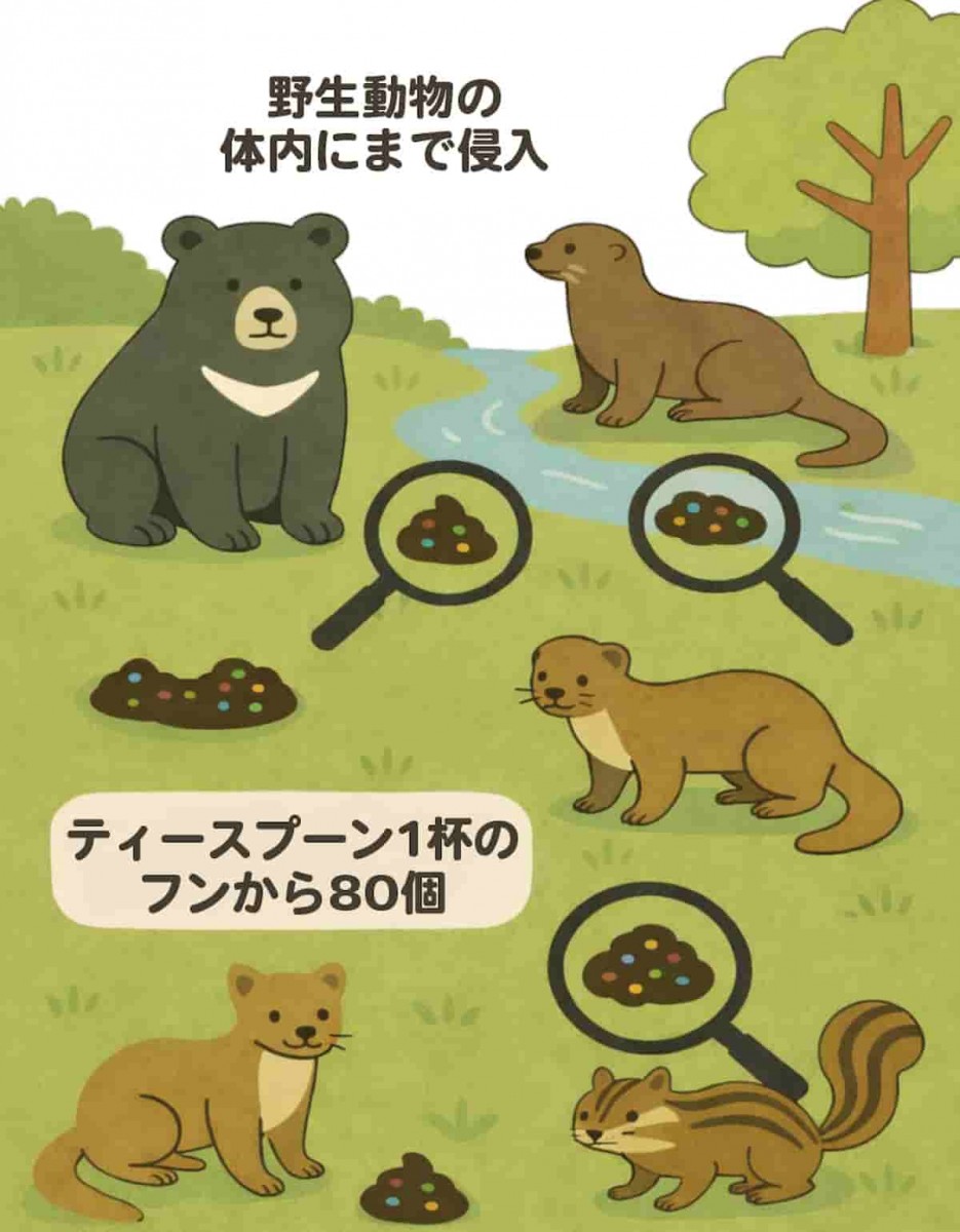 ちなみに、この調査対象となったツキノワグマやカワウソ、テンなど哺乳類の生活圏から採取したフンや水のサンプルからは、最大で1グラムあたり80個以上のマイクロプラスチックが見つかっています。これは、ティースプーン1杯のフンに、80個もの小さなプラスチック粒が混じっていたということです。