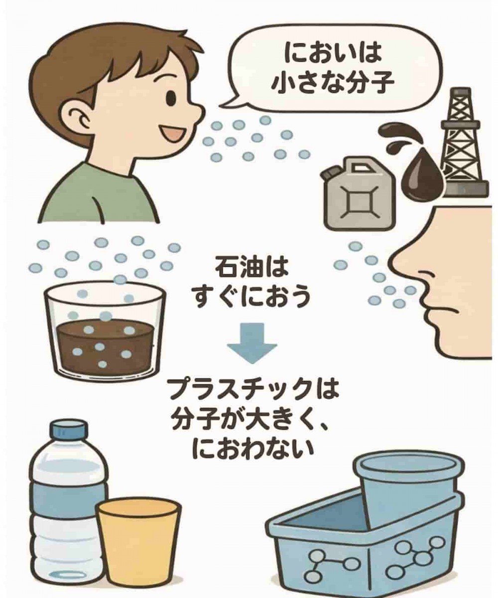 「石油のにおいってガソリンや灯油と同じようなにおいだよね? それなのに、石油からつくられるプラスチックは、なぜにおわないの?」と、ちょっと不思議に思いませんか?
