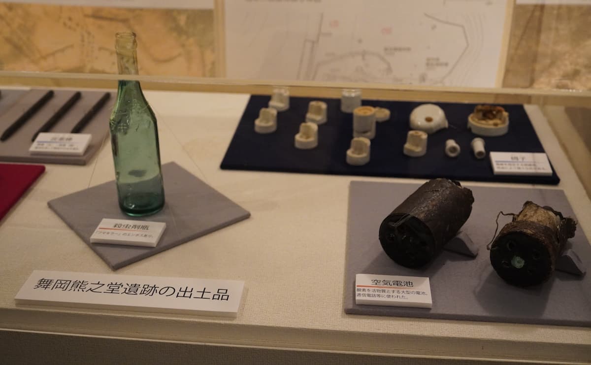遺構そのものだけでなく、そこから出土した遺物も戦争の実像を伝えます。照空灯に使われた炭素棒、陣地内の通信に使われていたとみられる空気式電池、さらにはカミソリやペン先、殺虫剤の瓶など、兵士たちの日常を感じさせる品々が見つかりました。